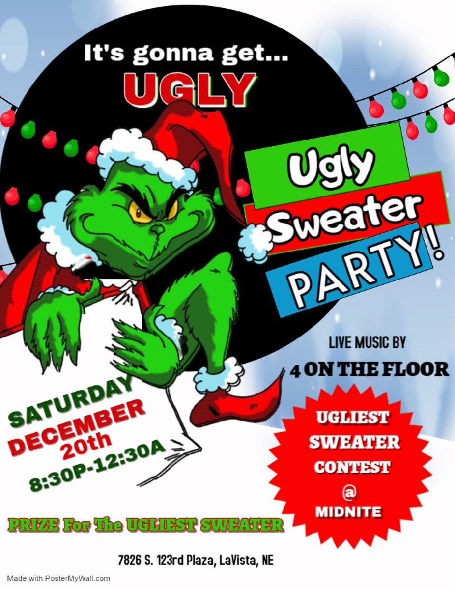 We will be having our annual Ugly Christmas Sweater Contest! Grab your friends and dust off those sweaters. Live music with 4 on the Floor!