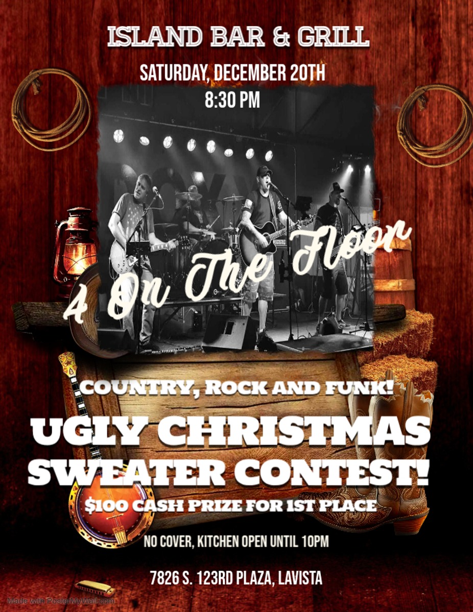 Island's annual Ugly Christmas Sweater Contest/Party! Enjoy the party with 4 on the Floor, playing your favorite, Country, Rock and Funk! $100 Cash Prize for the 1st place Ugly Sweater Contest!